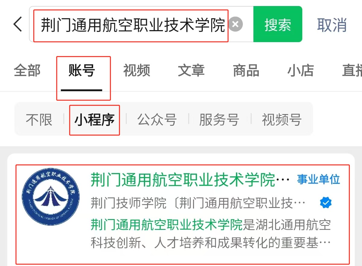 加入航院1.微信搜索“荆门通用航空职业技术学院”,点击“账号”,点击“小程序”,找到后即可进入小程序主页。