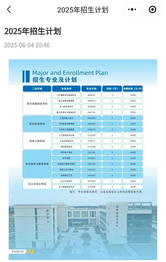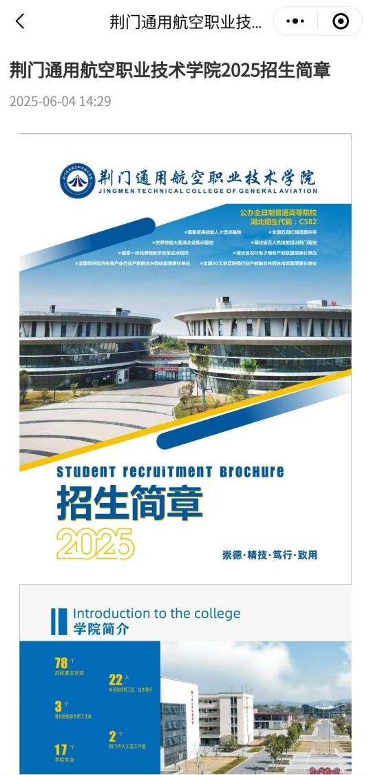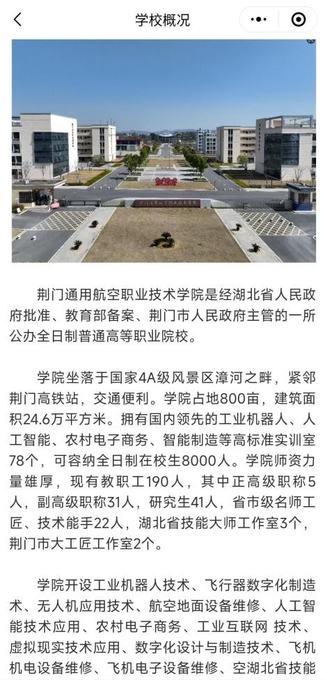 为让考生和家长了解最新招生资讯并及时解答考生和家长的疑惑荆门通用航空职业技术学院招生小程序惊喜上线学校概况 学院专业招生计划 历年分数招生简章 校园风光视频影像 联系我们8大核心板块助力考生做好志愿填报规划常见问题板块及时为考生和家长答疑解惑更有云游校园板块带你720°云览航院快和航小招一起去看看吧!走进航院学校概况 学院专业一站式阅览从培养方式到就业方向为你详细解读5个招生学院的17个招生专业