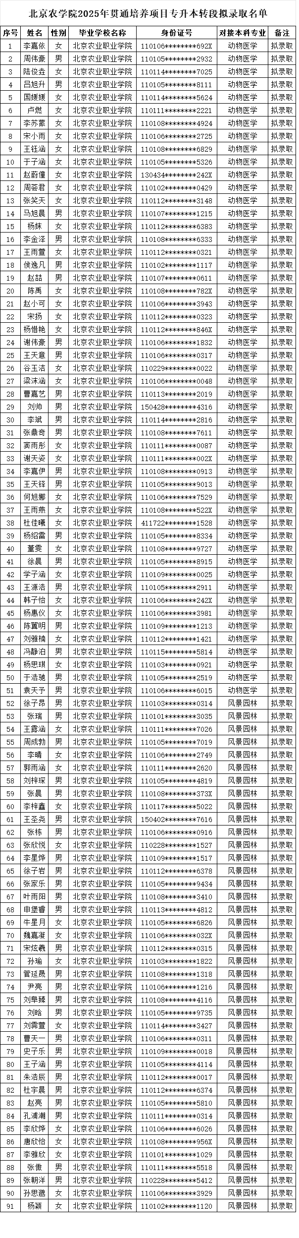 根据《北京教育考试院关于做好2025年贯通培养试验项目专升本转段有关工作的通知》和《北京农学院2025年北京市高端技术技能人才贯通培养试验项目专升本转段考试方案》等文件要求,坚决贯彻公平竞争、公正选拔、公开透明的原则,德智体美劳全面考核,综合评价总成绩达到60分(含60分)以上者,予以预录取,拟定以下考生为北京农学院2025年北京市高端技术技能人才贯通培养试验项目专升本转段预录取人员(具体名单见附件),现进行公示。