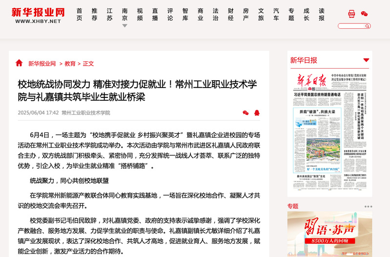 新华报业网:校地统战协同发力 精准对接力促就业!常州工业职业技术学院与礼嘉镇共筑毕业生就业桥梁