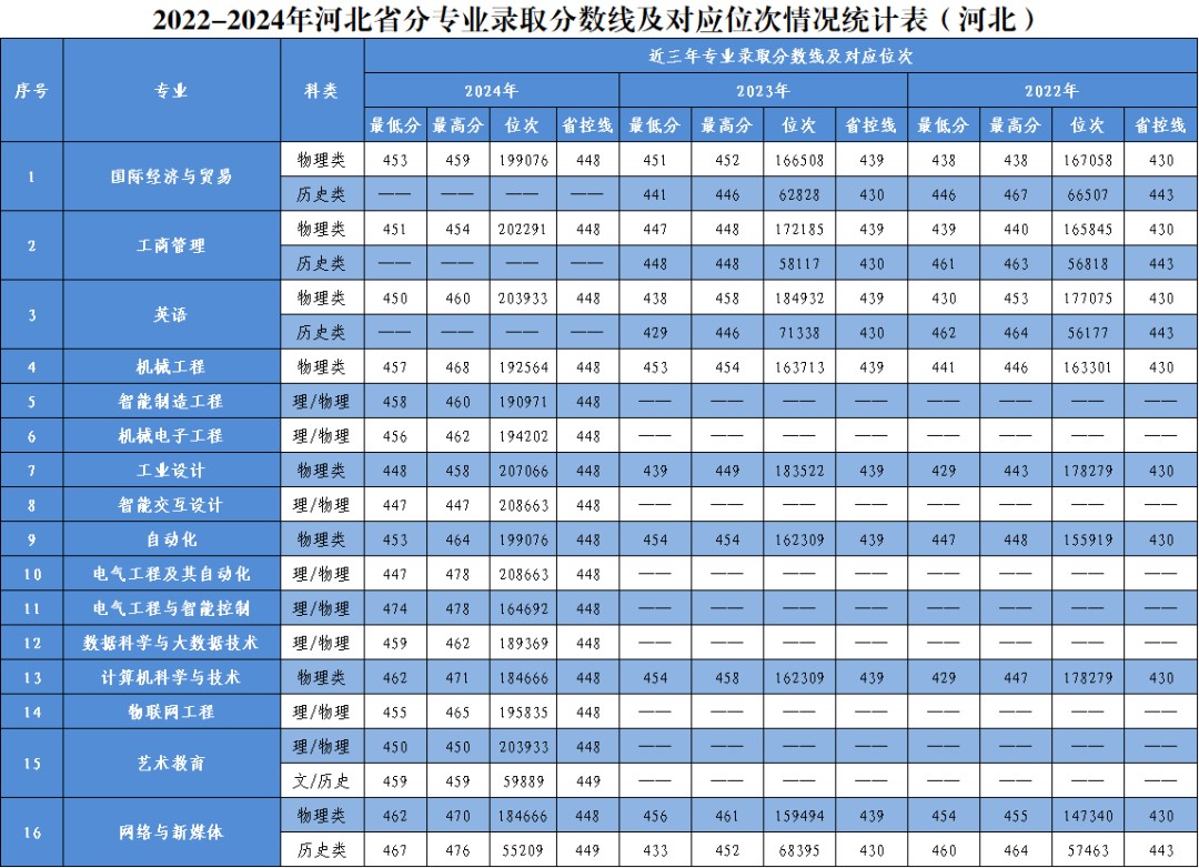 本期带来我校《2022-2024年河北省分专业录取分数线及对应位次情况统计表》。