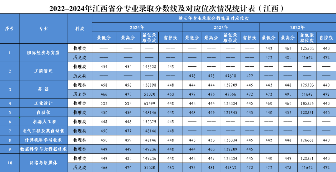 本期带来我校《2022-2024年江西省分专业录取分数线及对应位次情况统计表》。