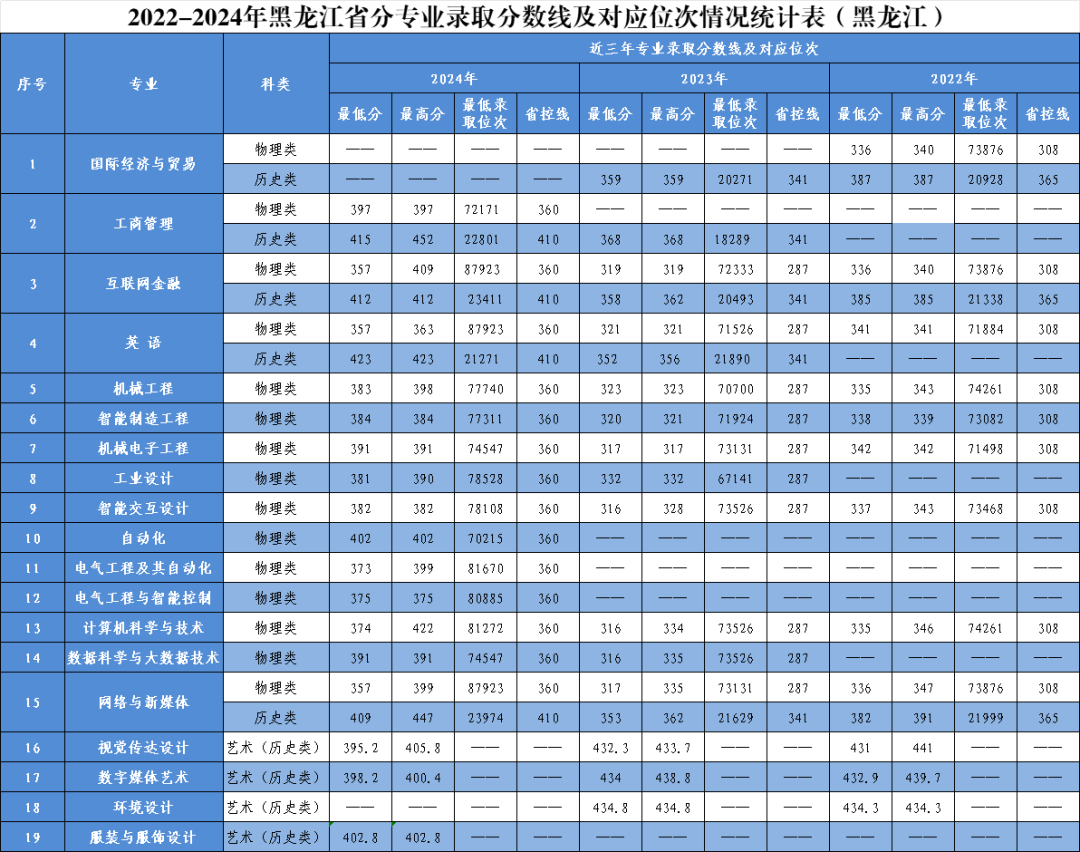 本期带来我校《2022-2024年黑龙江省分专业录取分数线及对应位次情况统计表》。