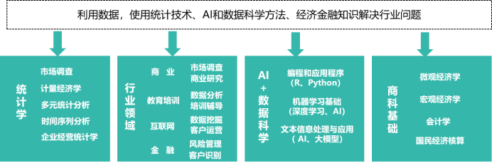 掌握Python、SQL软件应用与统计建模能力,适度掌握AI技术前沿应用,熟练掌握现代统计理论,融合政策设计、智能决策和数据治理,旨在培养“懂数据、通政策、精技术、善治理”的复合型数据人才。核心岗位包括市场调研、数据分析、市场咨询、数据挖掘岗位和数据要素化政策研究。