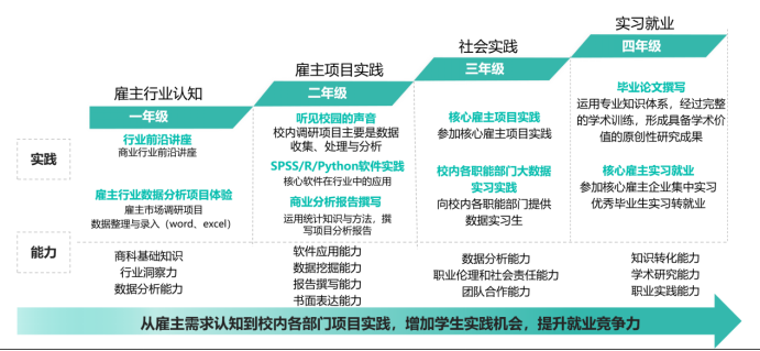 精准锚定新零售、市场研究、新互联网等领域,与易宝软件、亚信科技等头部企业共建“课程开发+双师教学+顶岗实战”培养路径,专业核心课100%采用实践教学,专业产业实践包85%实现校企共建。
