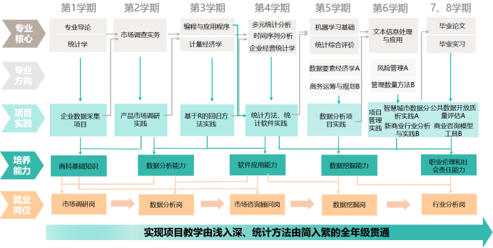 深入专业,着重机器学习、统计软件进阶训练,重点开展企业实践项目实训,提升前沿知识学习和解决企业真实问题的能力。
