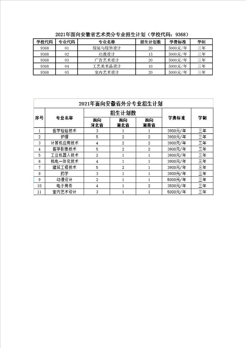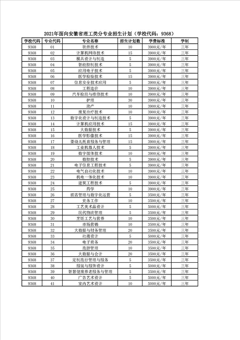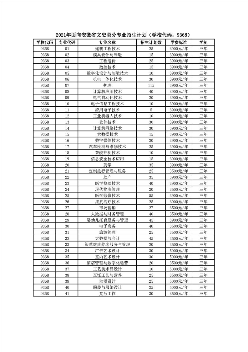 铜陵职业技术学院2021年普通高考分专业招生计划