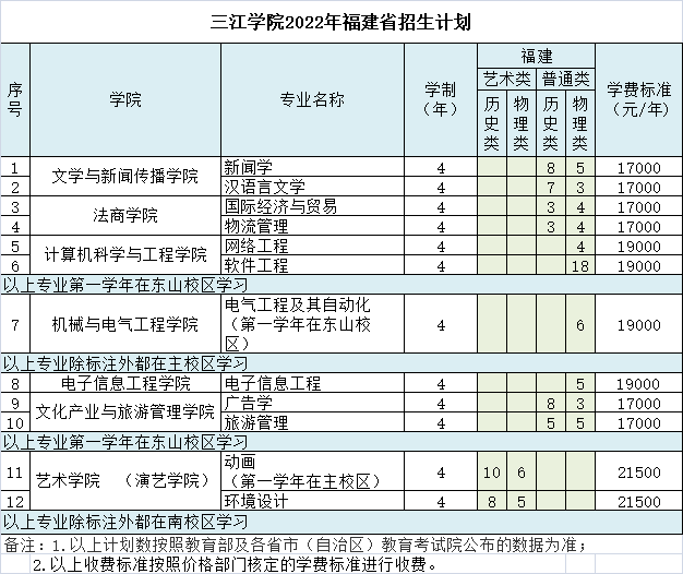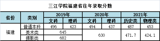 三江学院福建省往年录取分数和2022年招生计划