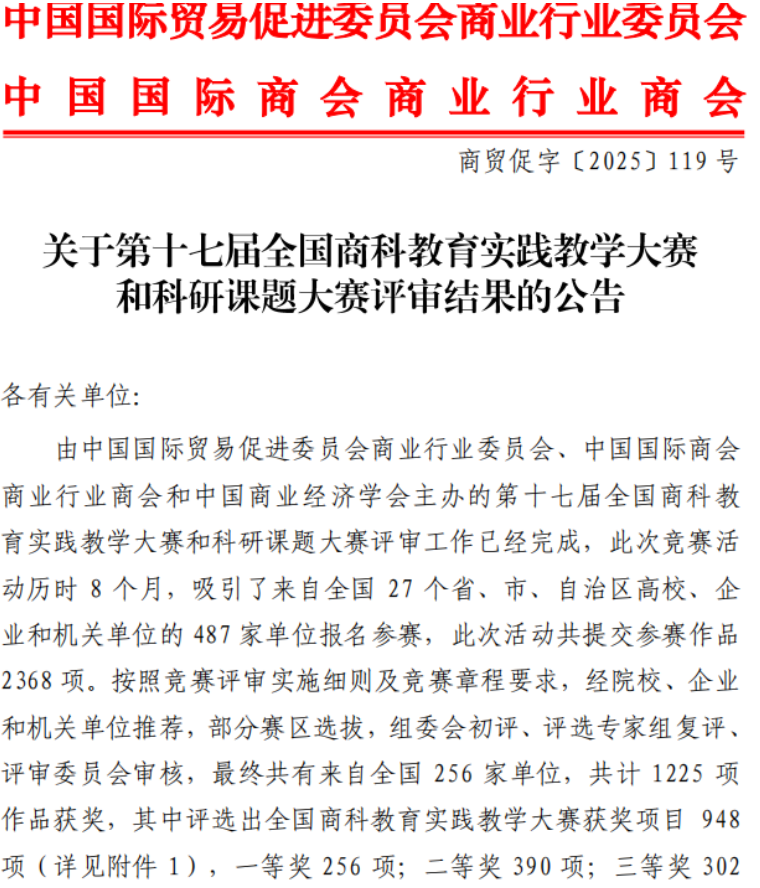 该赛事由中国国际商会商业行业商会、中国贸促会商业行业委员会联合主办,是中国高等教育学会《2024版全国普通高校教师教学发展指数》中唯一认定的商科类教师教学竞赛。 我校人力资源管理系教师首次参赛即斩获佳绩,充分体现了在专业课程体系优化、教育教学方法改革与实践教学创新等方面的特色成效,有力彰显了我系教师的教学能力与专业风采。 未来,人力资源管理系将持续以高水平教师教学竞赛为重要抓手,扎实推进教赛融合教育理念,深化教赛融合、课赛融合教学成果,促进教赛融合教育的高质量发展。