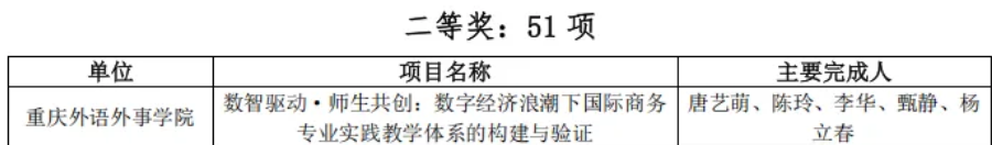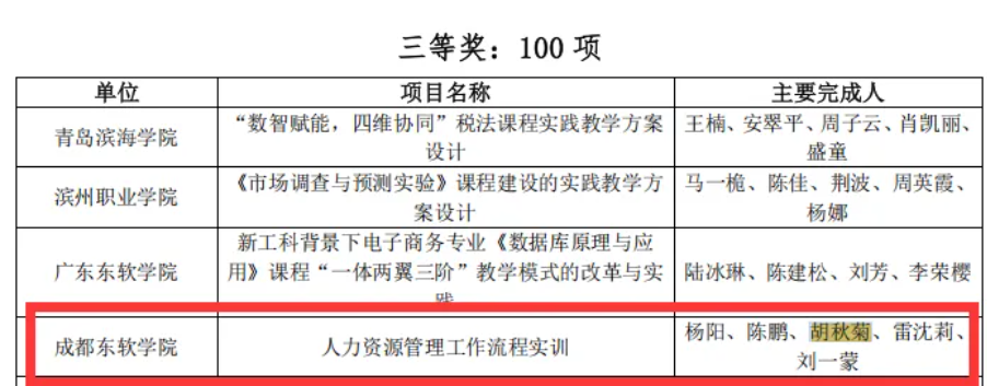 近日,我校人力资源管理系陈鹏、胡秋菊、杨阳、巩正阳、周楠教学团队共同完成的《“数字人力+川渝产业“双轮驱动的人力资源管理专业实践教学体系构建》以及胡秋菊、叶莹玲、刘一蒙、罗晓莉教学团队共同完成《人力资源管理专业一核两翼四平台课程思政实践教学方案设计》教学改革成果参加了第十七届全国商科教育实践教学大赛,获得专业建设整体实践教学方案设计竞赛项目二等奖;杨阳、陈鹏、胡秋菊、雷沈莉、刘一蒙教学团队完成的《人力资源管理工作流程实训》获得课程建设实践教学方案设计三等奖;胡秋菊、陈鹏教学团队完成的《人力资源管理专业“八协同”产教协同育人实践方案设计》获得配套实践教学方案设计赛道二等奖。参赛作品展示了人力资源管理系在教学体系建设、教师教学比赛、教改研究项目、学生竞赛、学生就业等方面取得的各项成绩。