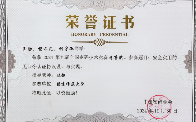 第九届全国密码技术竞赛特等奖