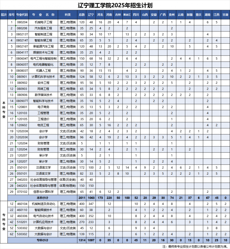 辽宁理工学院2025年招生计划