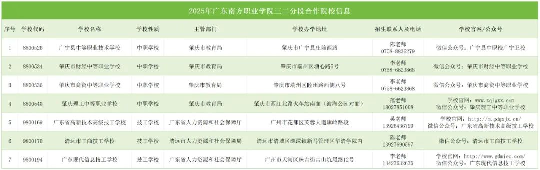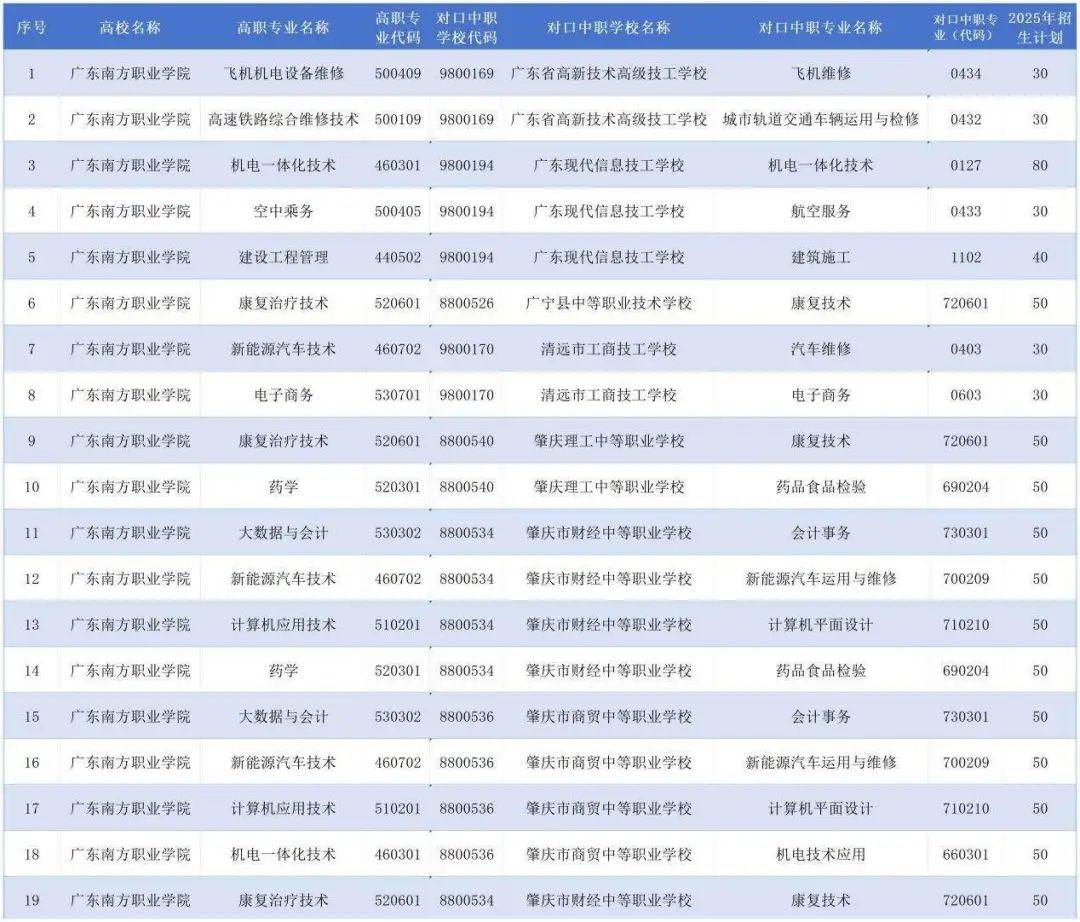 广东南方职业学院2025年与7间中职/技工学校进行合作共开设19个招生专业数。试点班学生中职学段(前3年)按照中等职业教育的管理办法进行管理,经转段考核,符合相关要求的,高职学段(中职学段毕业后2年)进入我校学习,符合毕业条件可获得广东南方职业学院全日制普通高校专科毕业证书。
