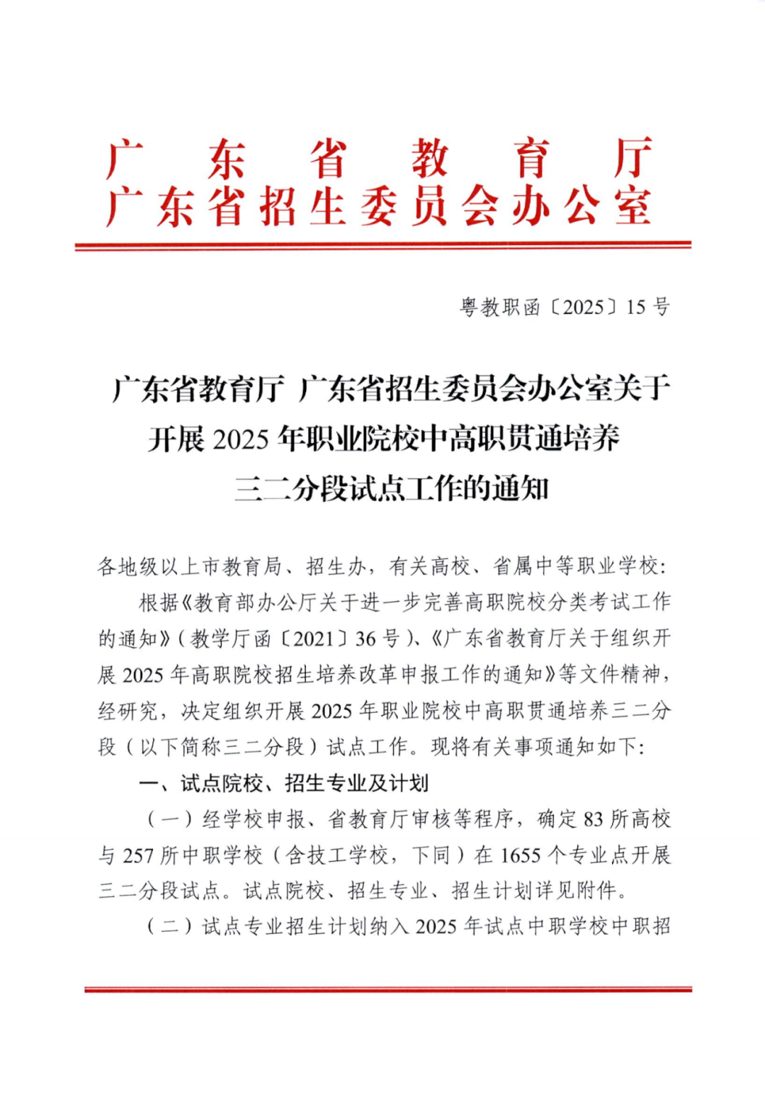 从广东省教育厅 广东省招生委员会办公室《关于开展2025年职业院校中高职贯通培养三二分段试点工作的通知》(粤教职函〔2025〕15号)文件获悉,我校2025年中高职贯通培养三二分段试点工作获得广东省教育厅审核通过。