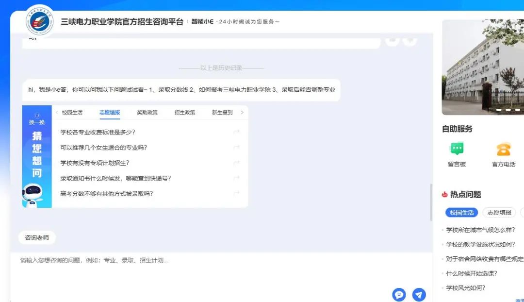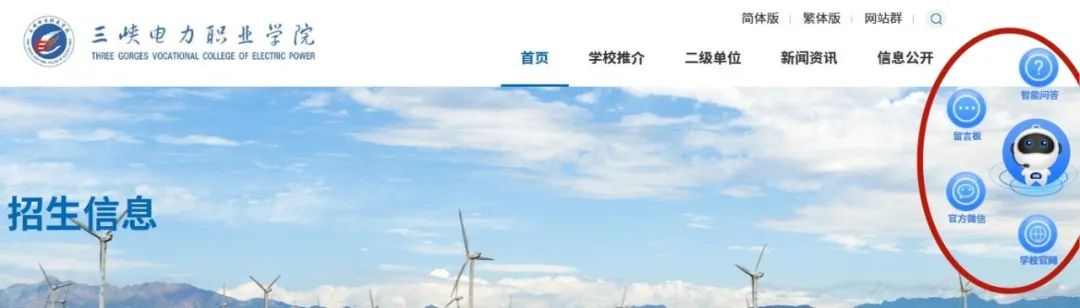 进入三峡电力职业学院招生信息网后,点击界面右侧“智能机器人小E”,准确填写基础信息后,可通过智能问答、留言板、直通专业三种途径进行招生咨询。