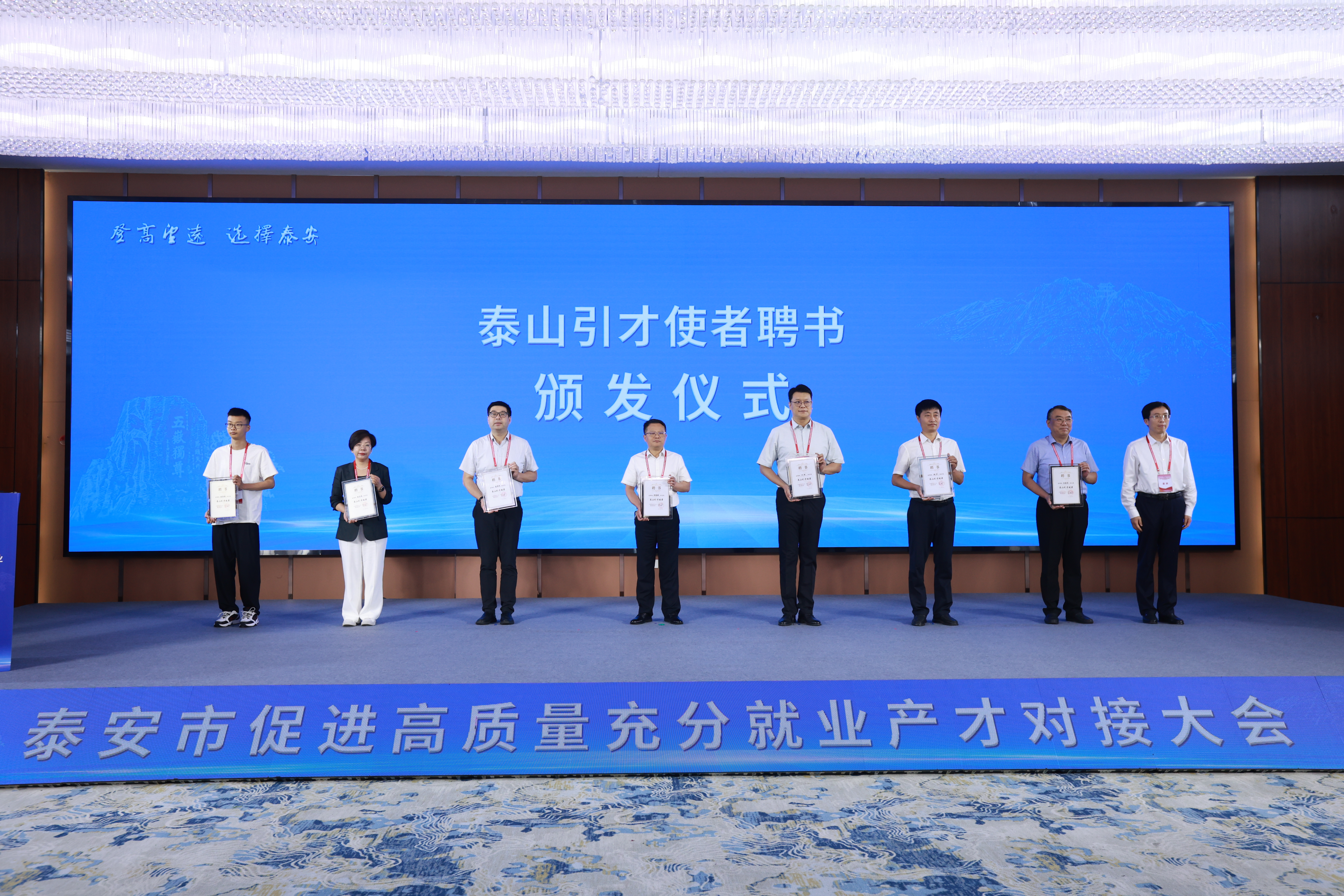 在泰安市促进高质量充分就业产才对接大会上,滁州学院受聘为“泰山引才使者”。周旭一行听取了人社部就业促进司原一级巡视员、中国就业促进会第四届筹委会副主任尹建堃关于《促进高质量充分就业形势和政策》的报告,了解了泰安市人才政策、产业链重点企业人才岗位需求、企业发展和人才需求,参加了“百校泰山引才使者泰安行”观摩活动,发放了学校2025届毕业生资源信息手册。