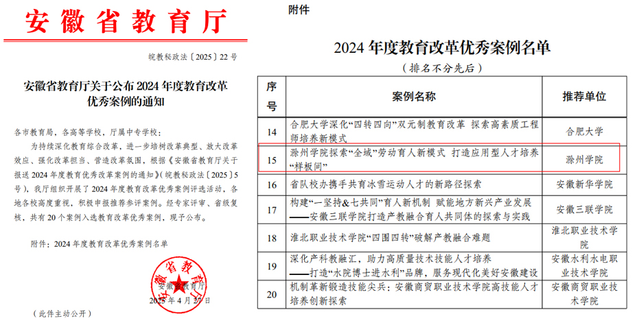 近日,安徽省教育厅公布2024年度教育改革优秀案例评选结果,学校申报的《滁州学院探索“全域”劳动育人新模式 打造应用型人才培养“样板间”》案例成功入选,成为全省同类应用型高校中唯一获此殊荣的单位。