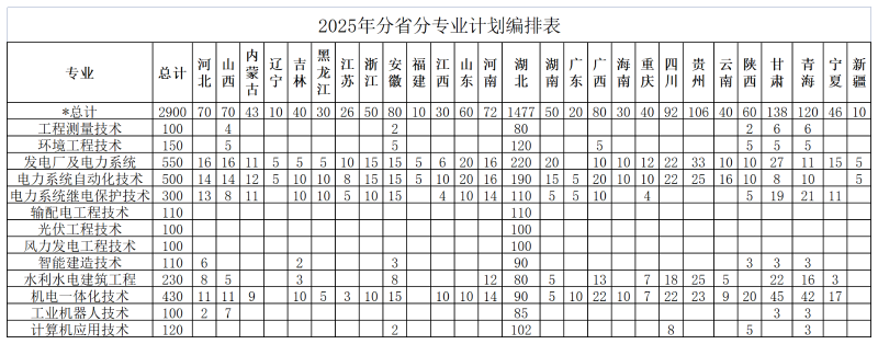 2025年三峡电力职业学院分省分专业招生计划
