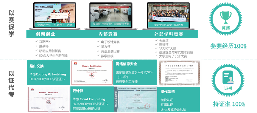 专业采用校内校外部竞赛联动机制,保证学生100%具有参加学科竞赛的体验。设置以证代考课程群,保证学生100%考取行业认证,学生可以结合自身优势和兴趣考取行业认证,助力高质量就业。
