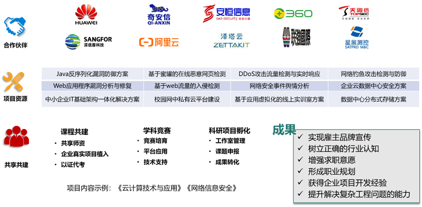 与华为技术有限公司、中兴通讯股份有限公司、奇安信科技集团股份有限公司、安恒信息技术股份有限公司开展深入合作,课程共建、资源共享、定向推荐就业,全流程校企共育。