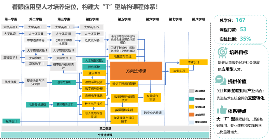 专业遵循国标要求,基于OBE理念,着眼应用型人才培养定位,构建了理论基础够用,专业课程与实践比例加重的大“T”型课程体系,方便根据产业发展及市场人才需求灵活、敏捷迭代专业方向,符合信息通信领域的快速发展需求。