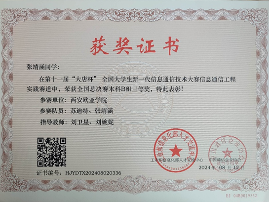 ■2024年获得第十一届大唐杯全国大学生新一代信息技术通信大赛三等奖