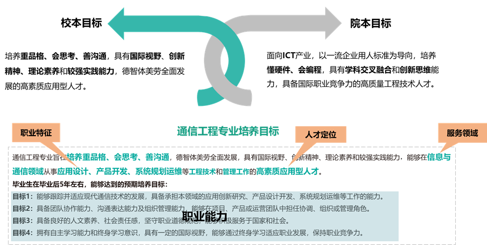 通信工程专业旨在培养重品格、会思考、善沟通,德智体美劳全面发展,具有国际视野、创新精神、理论素养和较强实践能力,能够在信息与通信领域从事应用设计、产品开发、系统规划运维等工程技术和管理工作的高素质应用型人才。