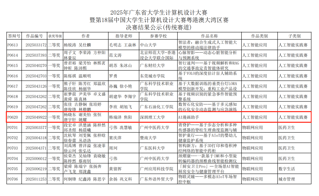 近日,2025年广东省大学生计算机设计大赛落下帷幕。由深圳理工大学大一学生杨晓东、谢美怡、张恒、唐宇轩、姚耀组成的“编程零基础”队伍,携作品“AI漫画助手”从众多参赛队伍中脱颖而出,一举斩获大赛一等奖。
