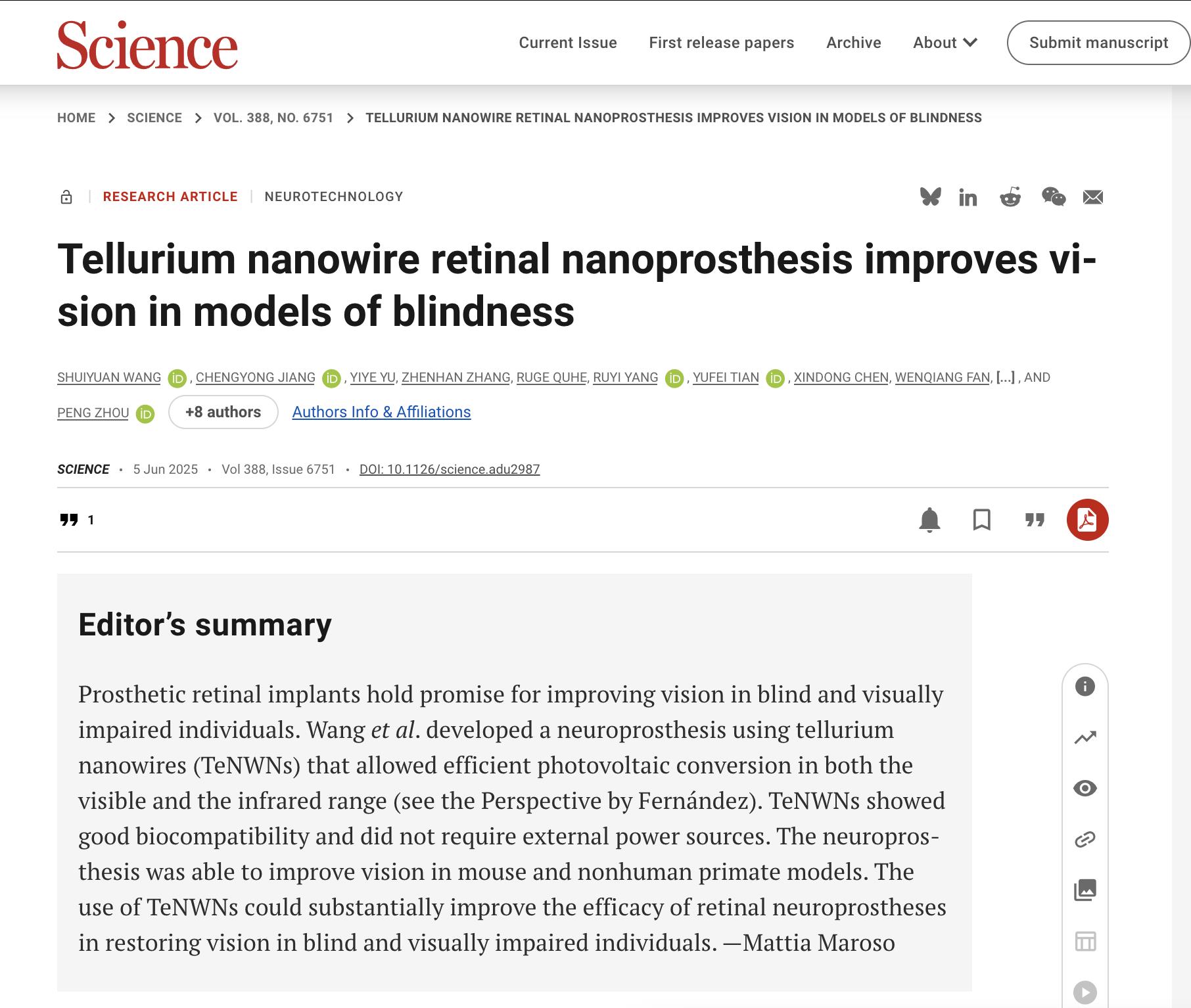 近日,北京邮电大学科研团队与复旦大学、中科院等多家单位联合在《Science》杂志发表了题为 “Tellurium nanowire retinal nanoprosthesis improves vision in models of blindness” 的研究成果(Science,DOI:10.1126/science.adu2987)。该研究开发出一种基于碲纳米线网络的视网膜纳米假体,为解决视网膜退行性疾病患者的光感知能力丧失问题提供了新方案。