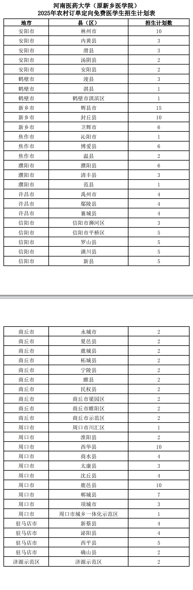 河南医药大学(原新乡医学院)2025年农村订单定向免费医学生招生计划表