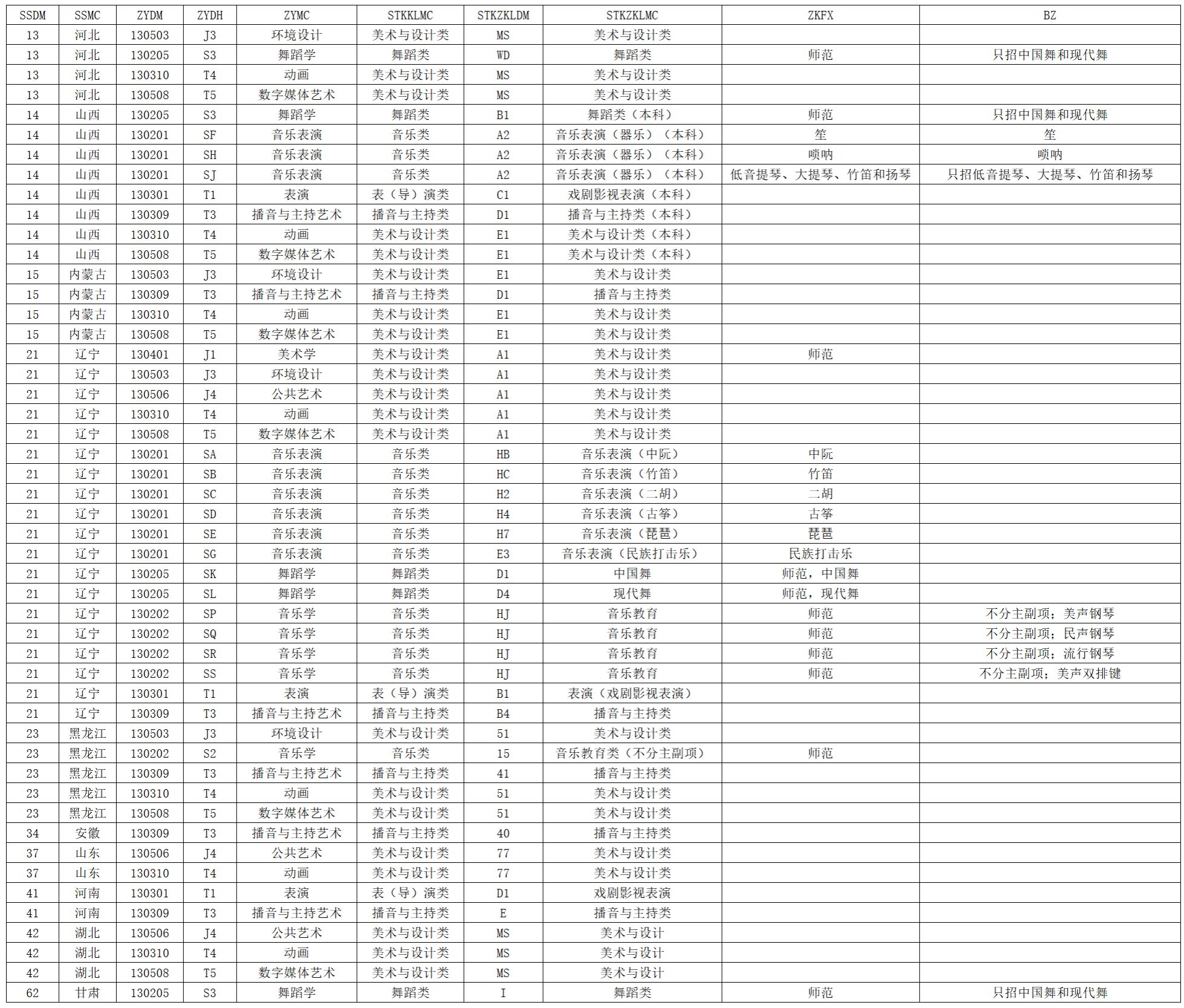 辽宁师范大学2025年本科艺术类专业与子科类对照表