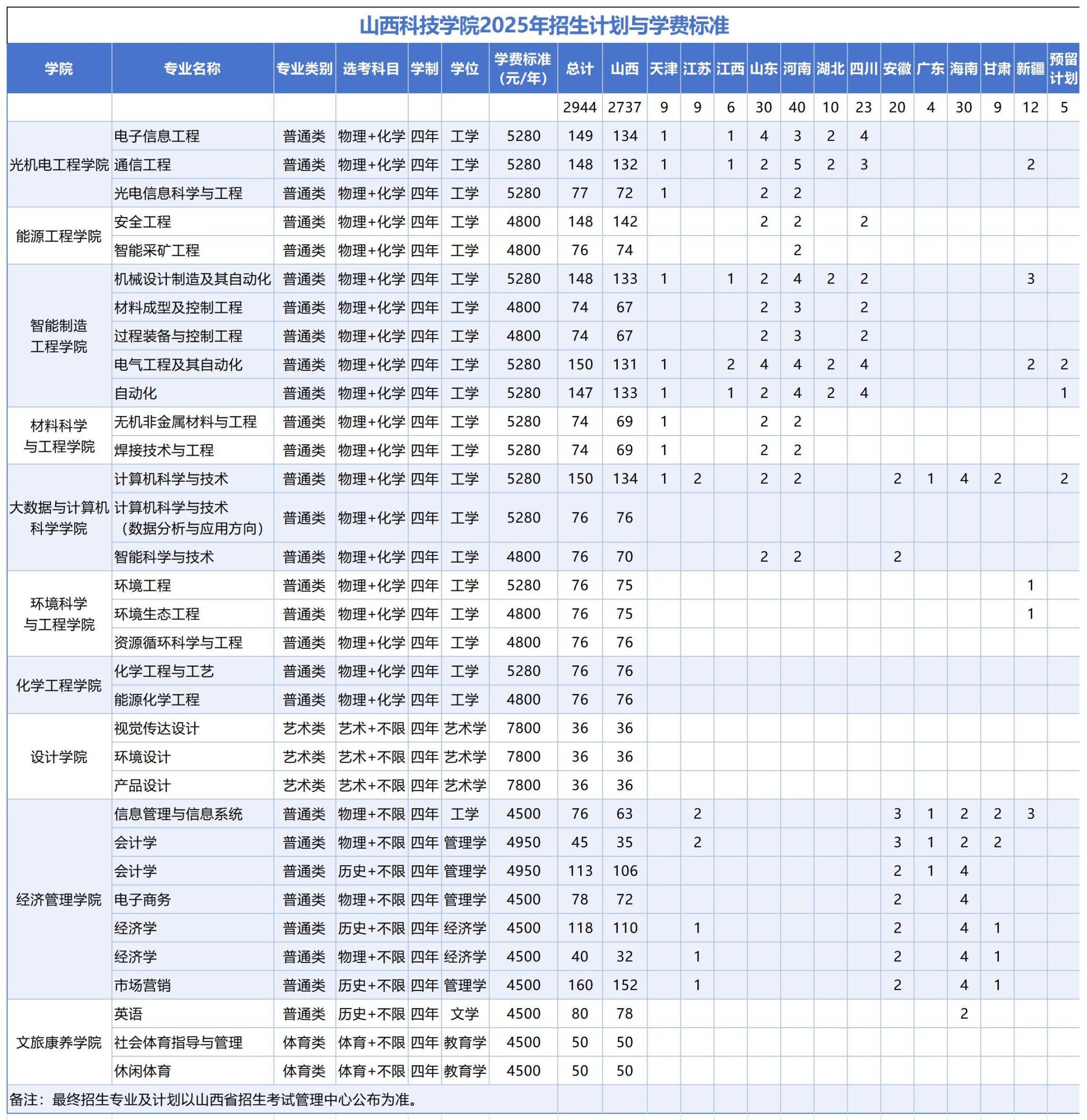 山西科技学院2025年本科招生计划