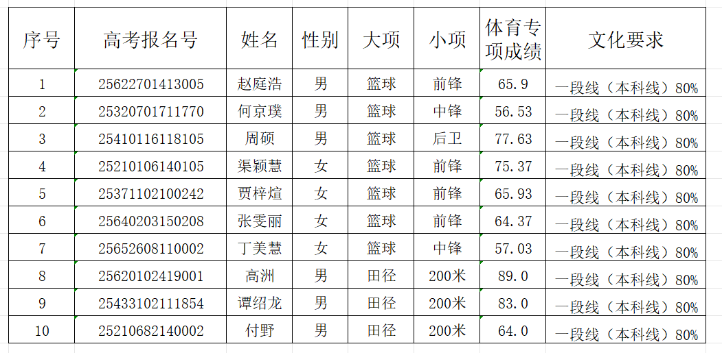 根据《教育部办公厅关于做好2025年普通高等学校部分特殊类型招生工作的通知》(教学厅〔2024〕7号)和《山东省教育招生考试院关于做好2025年普通高等学校在山东省招收高水平运动队相关工作的通知》(鲁招考〔2025〕2号)精神,结合《鲁东大学2025年高水平运动队招生简章》规定,依据招生计划和考生成绩,现将专项考试合格考生名单予以公示。