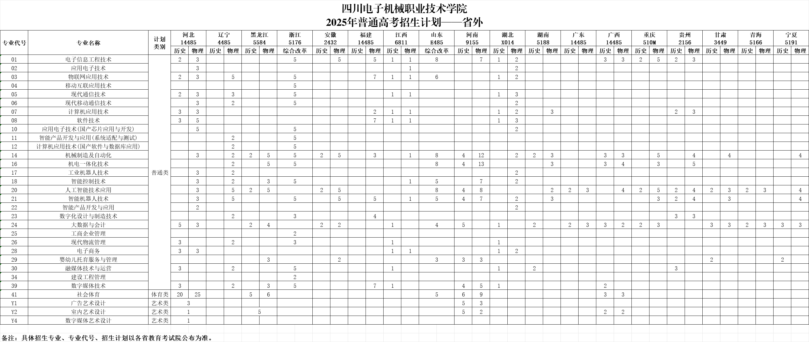 四川电子机械职业技术学院 2025年普通高考招生计划——省外