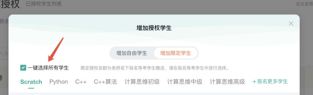 本次升级新增题库限定名额的“一键选择所有学生”功能,方便拥有大量等级考试学生的教师用户高效管理题库授权操作,无论是日常练习还是备考冲刺,都能一键操作,轻松搞定。