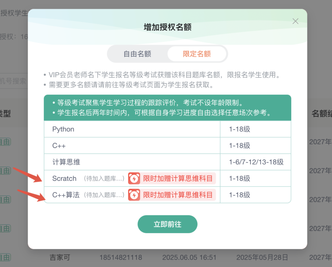 现在购买Scratch、Python、C++、C++算法等级考试均加赠计算思维科目题库限定名额,名额有效期同购买科目有效期一致。多科联动,全面助力教师打造高效课堂!
