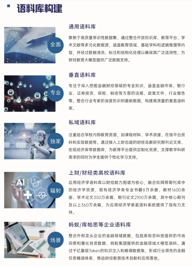 匡时财经教育大模型的研发,植根于上海财经大学应用经济学(A+)等优势学科,以及多学科交叉融合的创新体系。项目构建了覆盖经济、金融、会计、统计等核心学科的高质量、多模态语料库,整合了包括经典教材、专业书籍、学术论文、期刊文献、精品教学资源及企业级金融数据(如库帕思量化数据、蚂蚁电商金融案例等)在内的海量信息,并据此建立了标准化的财经知识图谱。