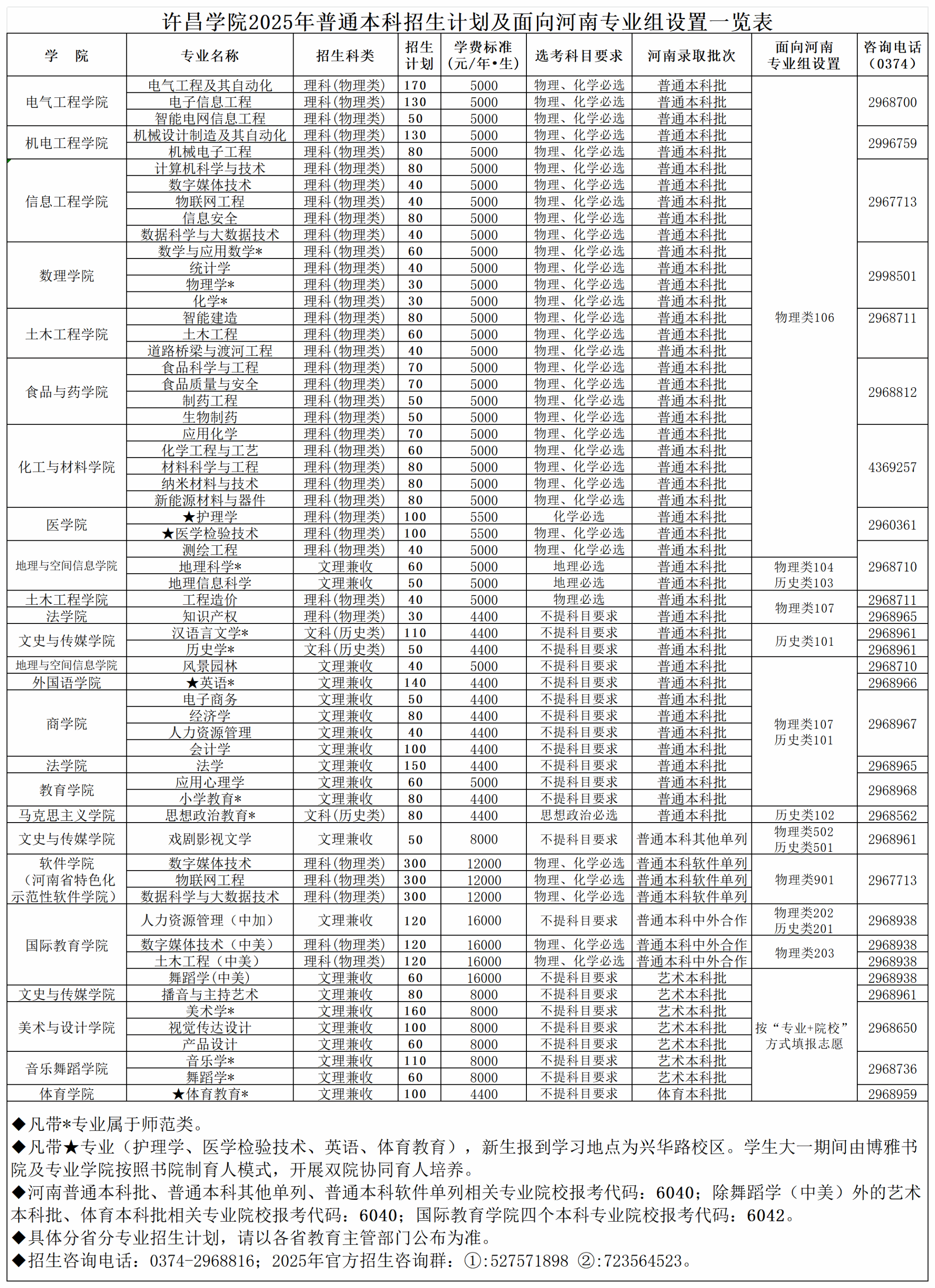 许昌学院2025年普通本科招生计划及面向河南专业组设置一览表