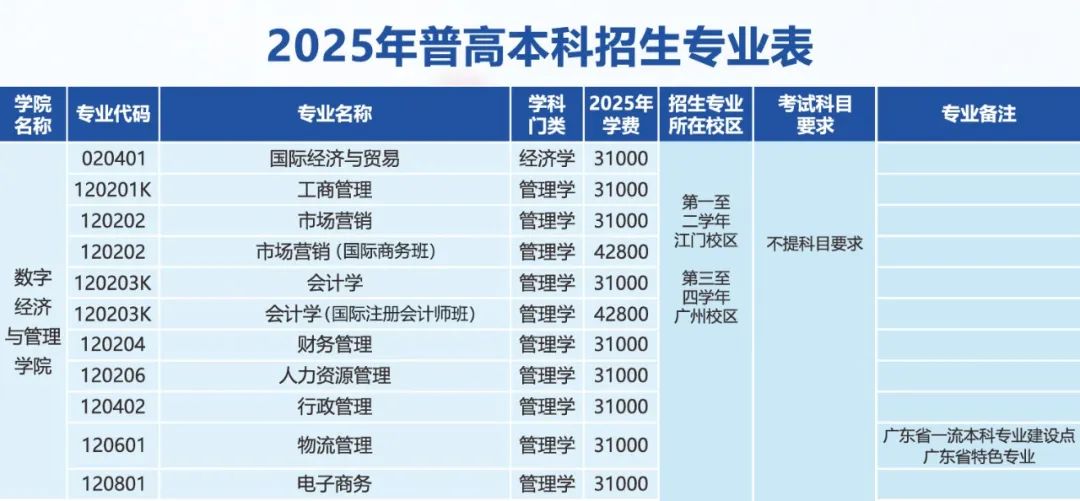 3.2025年数字经济与管理学院普通本科招生专业第一至二学年江门校区第三至四学年广州校区。