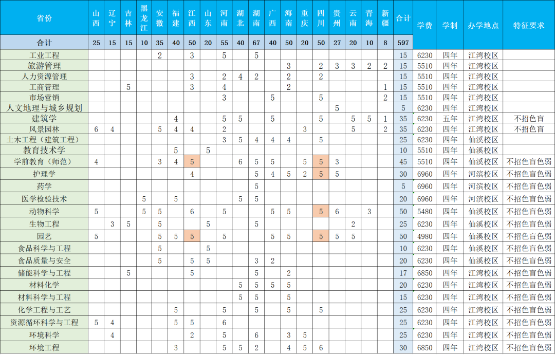 3.江西省的学前教育(师范)、园艺,四川省的学前教育(师范)、园艺、护理学、动物科学专业为国家专项计划(表格中橙色高亮处)。
