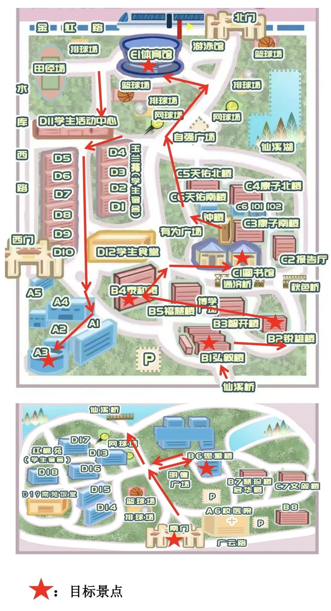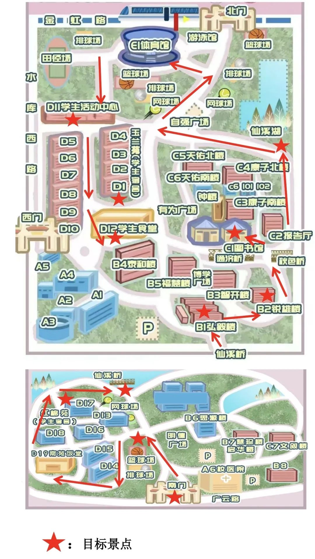 筑梦未来线路提供导览服务,师兄师姐化身导览员带着大家走校园。南门服务点集合,分别在9:30、10:00、10:30、11:00分四批次游校园!爱自然风光走自然生态线,对前沿科技感兴趣必选专业特色线(重点实验室全开放!),领略红色文化就选党建思政线。