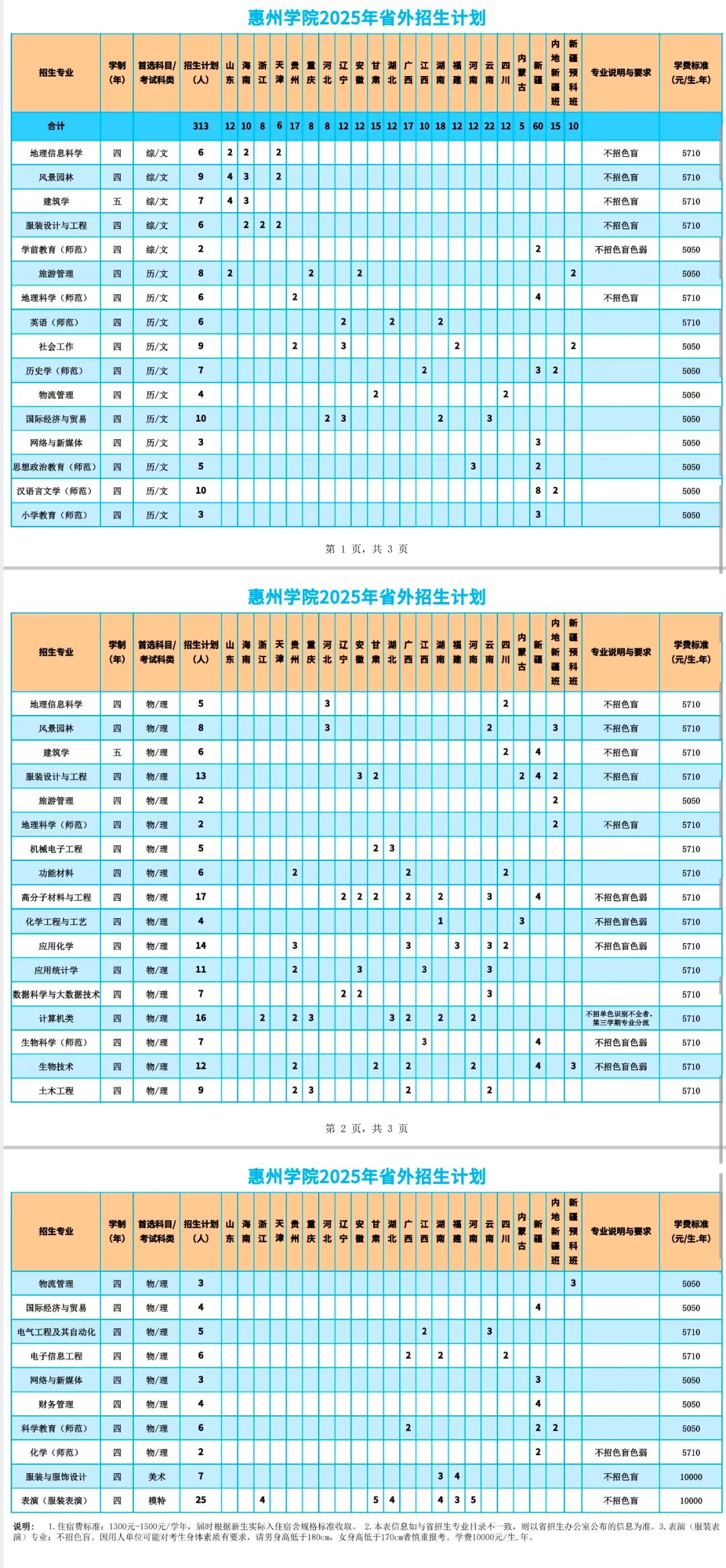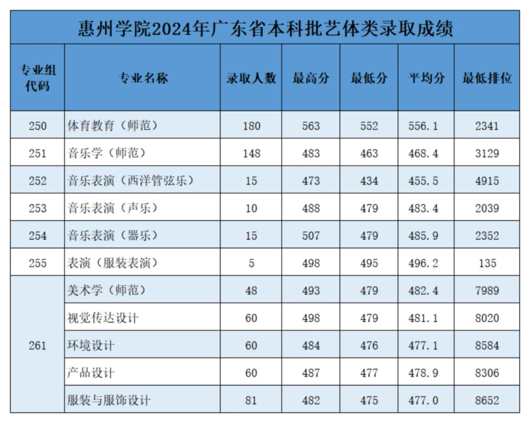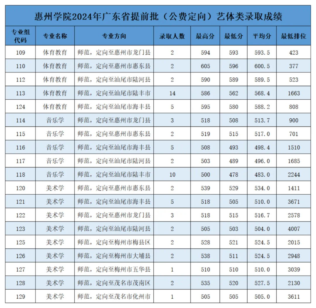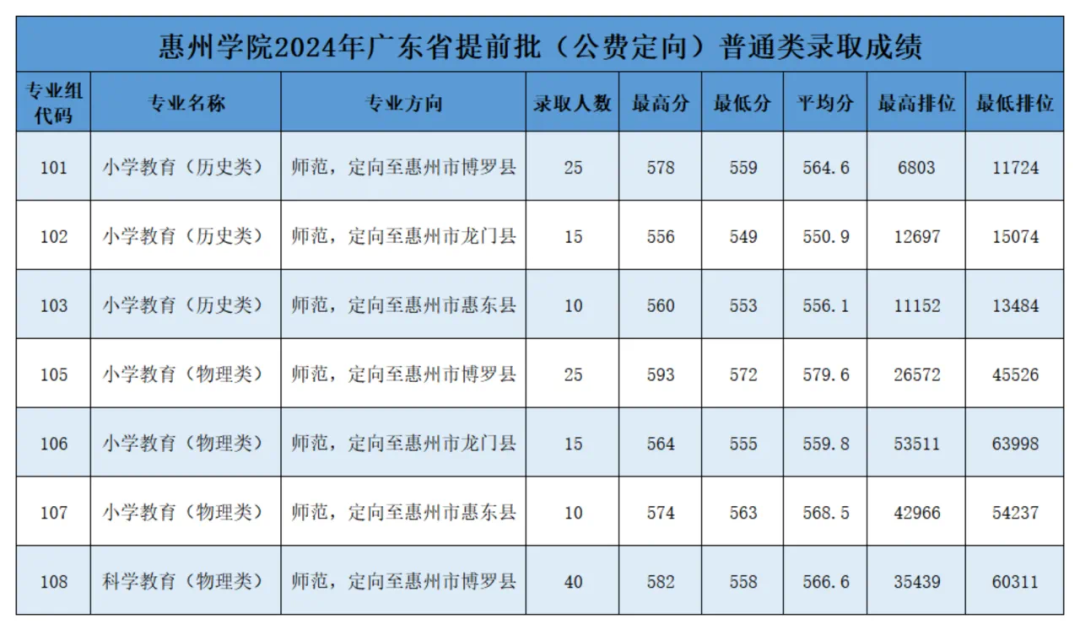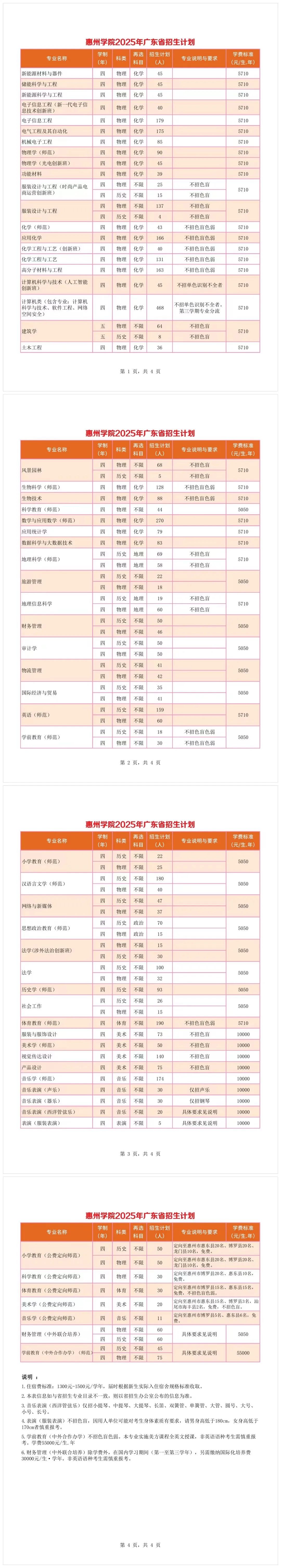 1.2025年,惠州学院广东省内招生计划:普通类(物理)计划3665人;普通类(历史)计划1218人;美术类计划358人;音乐类计划265人;体育类计划220人;表演类计划5人。其中教师专项(公费定向)培养招生计划191人(含小学教育专业100人、科学教育专业30人、体育教育专业30人、音乐学专业11人、美术学专业20人)。