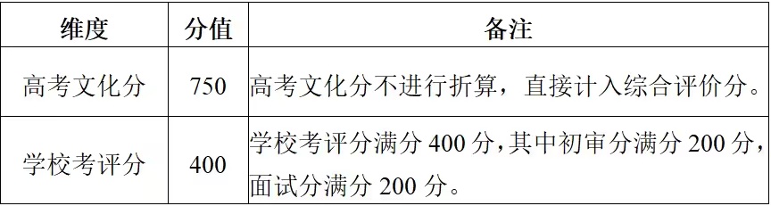 综合评价分满分为1150分,具体计算方法为:综合评价分=高考文化分+学校考评分。