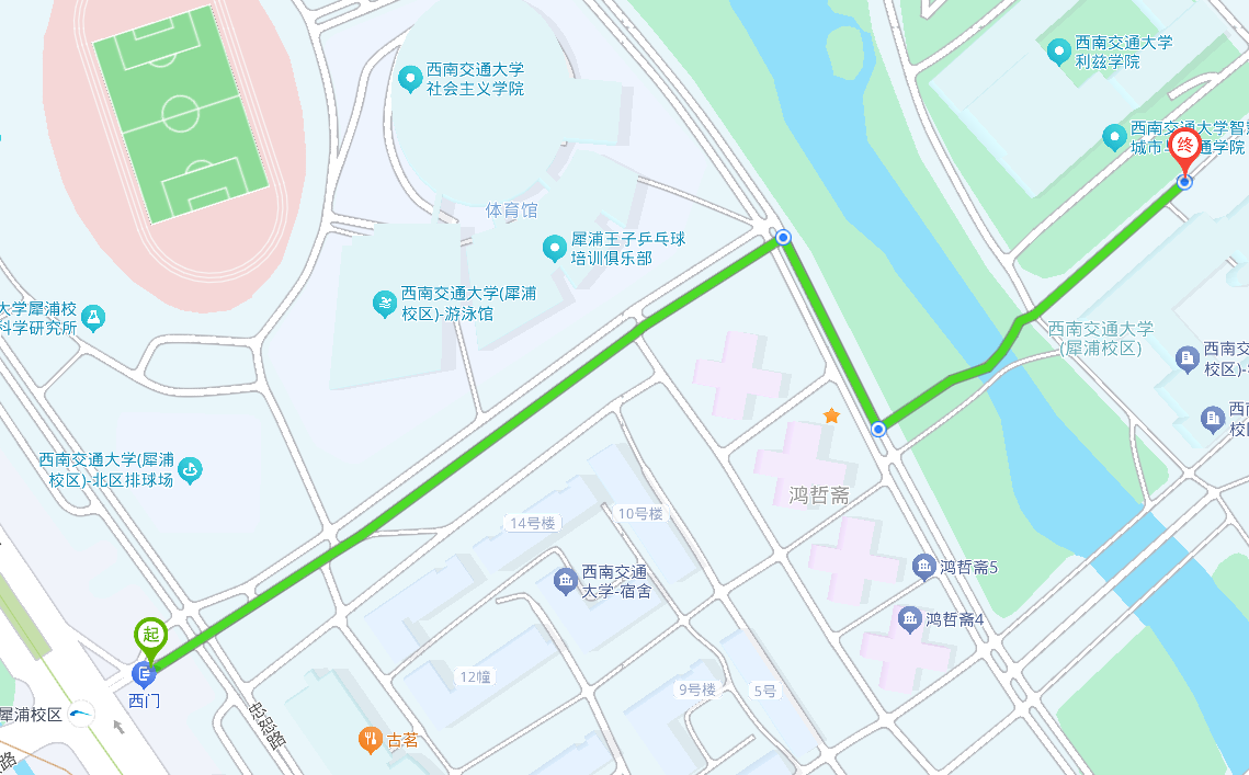 犀浦校区西门前往交运楼(11号教学楼)路线,约1.4千米