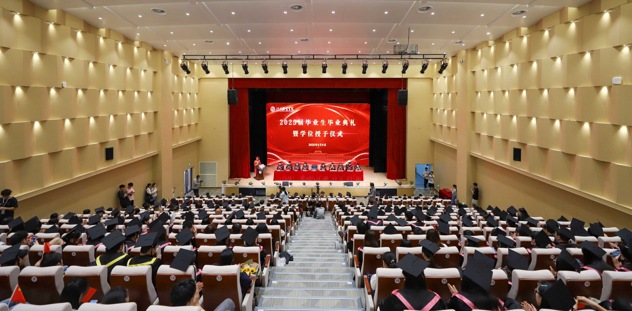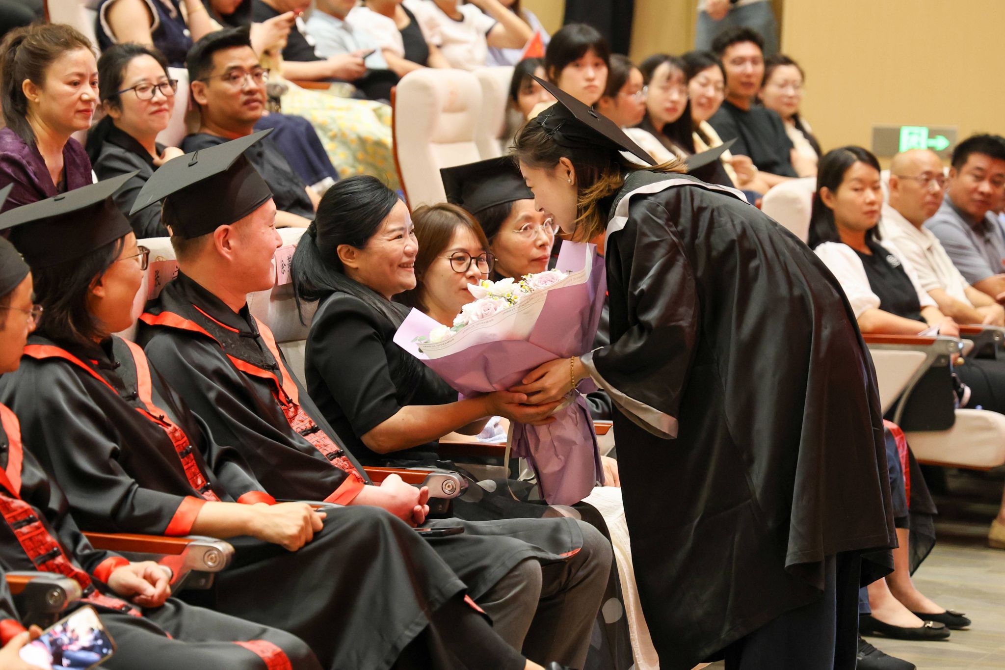 典礼现场处处是毕业生们向恩师和亲友赠送鲜花,与同学相拥合影的场面,报告厅内洋溢着浓浓的温暖与感动,这一幕幕感人瞬间也必将镌刻在毕业生的脑海里。
