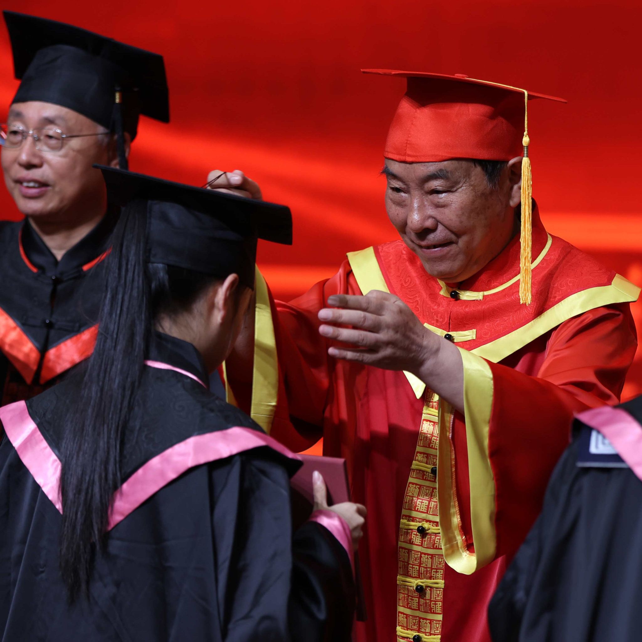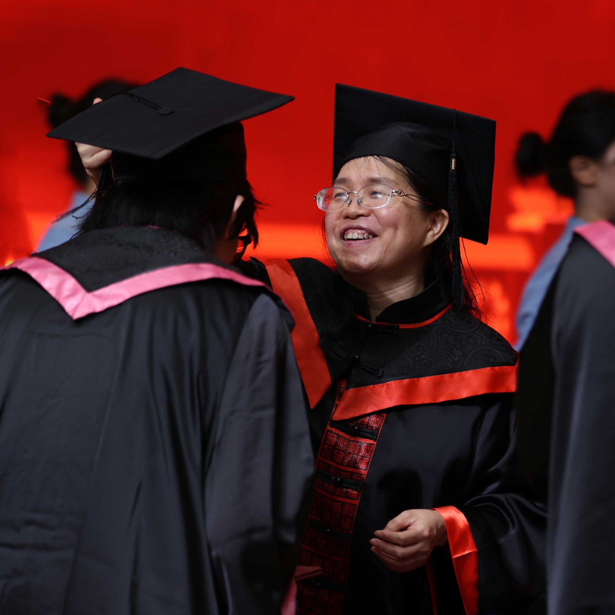 在热烈的掌声中,校学位评定委员会成员为毕业生代表逐一拨穗正冠,颁发学士学位证书,并合影留念。