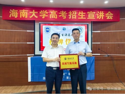 海南大学党委常委、副校长聂清斌一行走进鄂州高中开展2024年本科招生宣讲活动,在学术报告厅开展了一场别开生面的高考招生宣讲活动,提供学校办学理念、师资力量、专业介绍、现场咨询等服务,并授予鄂州高中“优质生源基地”荣誉称号。