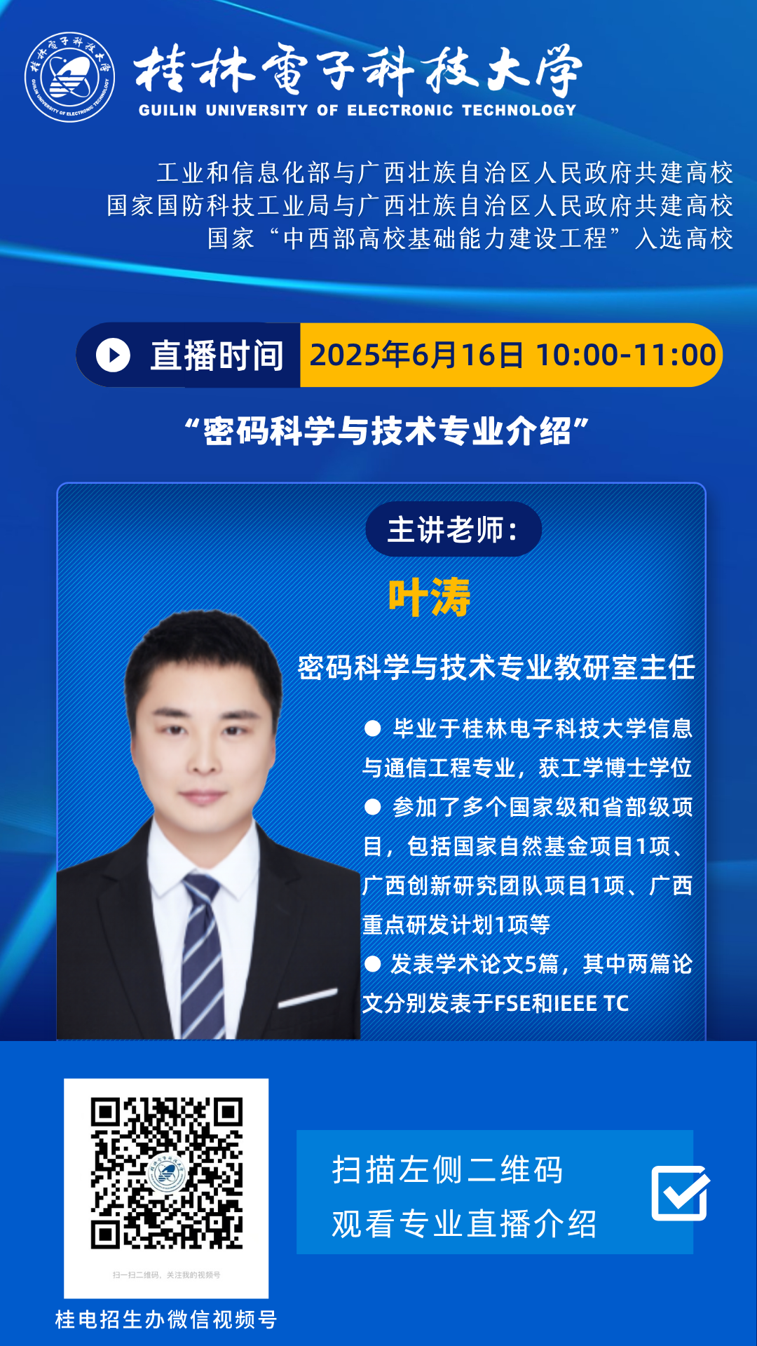 叶涛,博士,2021年12月毕业于桂林电子科技大学信息与通信工程专业,获工学博士学位。目前任桂林电子科技大学密码科学与技术专业教研室主任,主要研究方向为对称密码算法设计与分析。主持国家自然科学基金青年基金项目1项,并参加了多个国家级和省部级项目,其中包括国家自然基金项目1项、广西创新研究团队项目1项、广西重点研发计划1项等。发表学术论文5篇,其中两篇论文分别发表于Fast Software Encryption和IEEE Transactions on Computers。