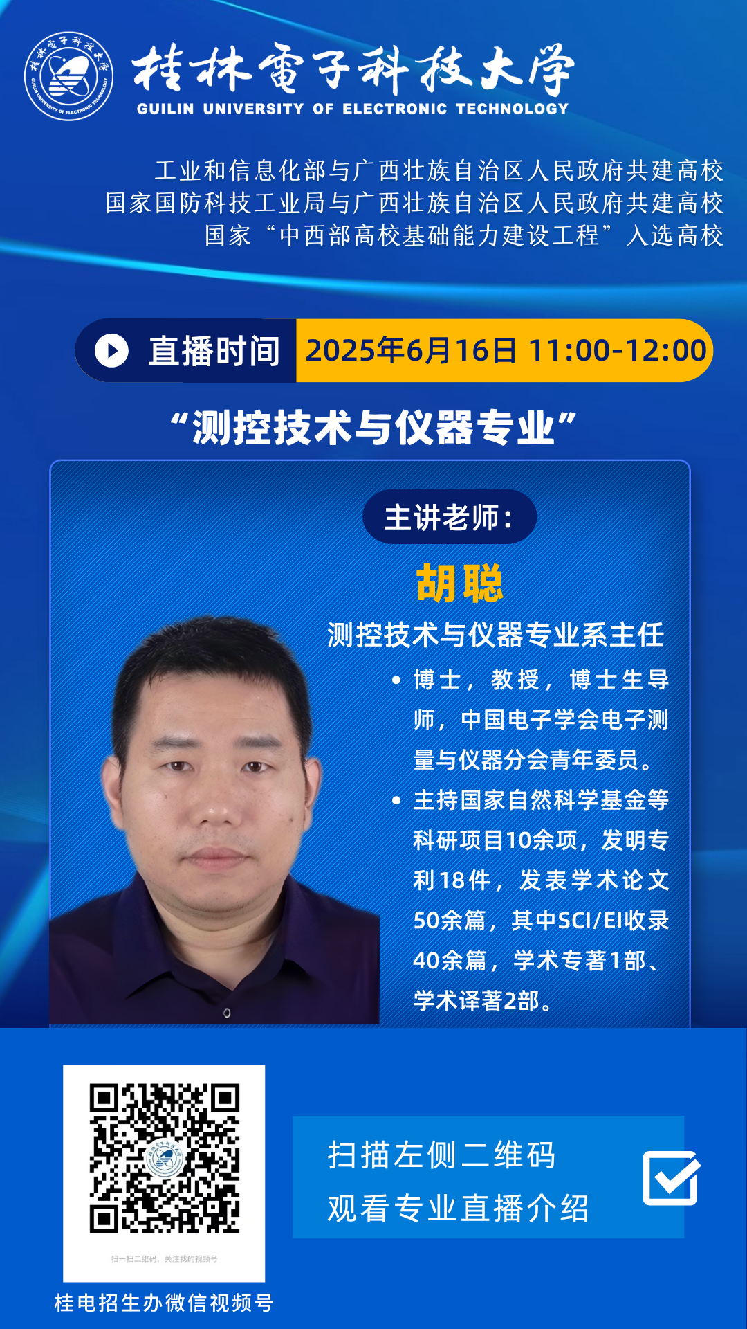 胡聪,博士,教授,博士生导师,测控技术与仪器专业系系主任,虚拟仿真实验教学创新联盟仪器类专业工作委员会委员,中国电子学会电子测量与仪器分会青年委员。主持国家自然科学基金、广西自然科学基金等科研项目10余项,主要参加国家级、省部级科研项目30余项。获得发明专利18件,获“广西科技进步奖二等奖”3项、“中国电子学会科技进步二等奖”1项。发表学术论文50余篇,其中SCI/EI收录40余篇,出版学术专著1部、学术译著2部。获广西教学成果奖一等奖1次、三等奖1次,获全国教师教育教学信息化交流活动二等奖1次。