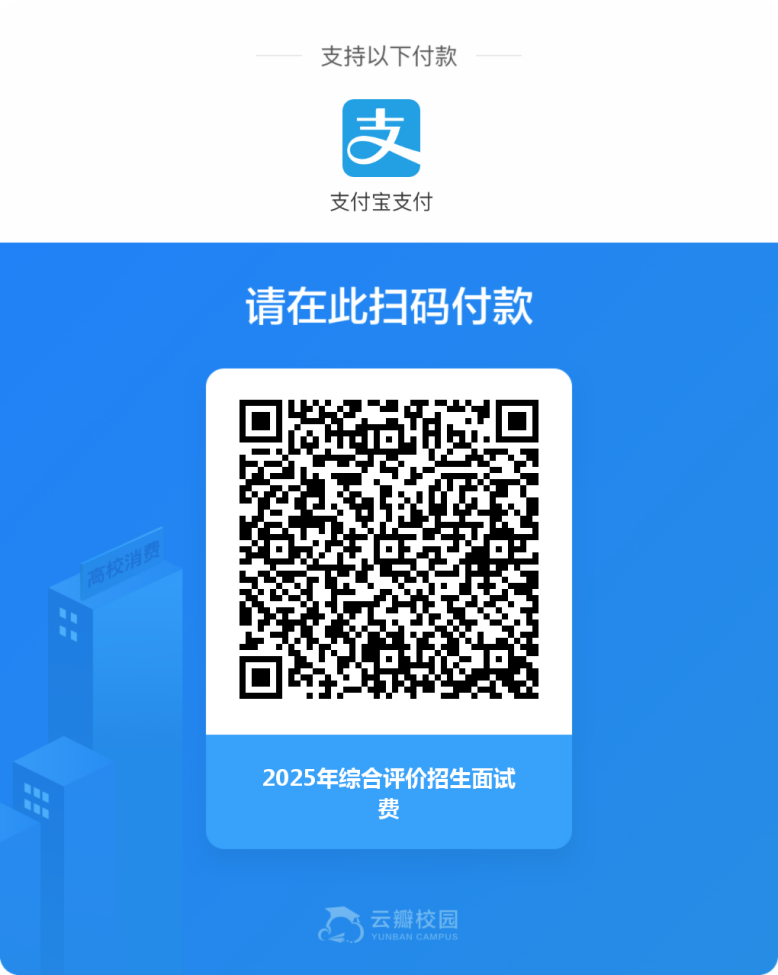 根据《山东省发展和改革委员会 山东省财政厅关于高校组织招生考试收费标准的批复》(鲁发改价格〔2024〕58号),高校组织的综合评价招生考试面试收费标准为:50元/生。请入围面试的考生,于2025年6月15日—6月16日考试前扫描下方支付宝二维码,并正确填写考生姓名、身份证号,完成缴费。谢谢配合。